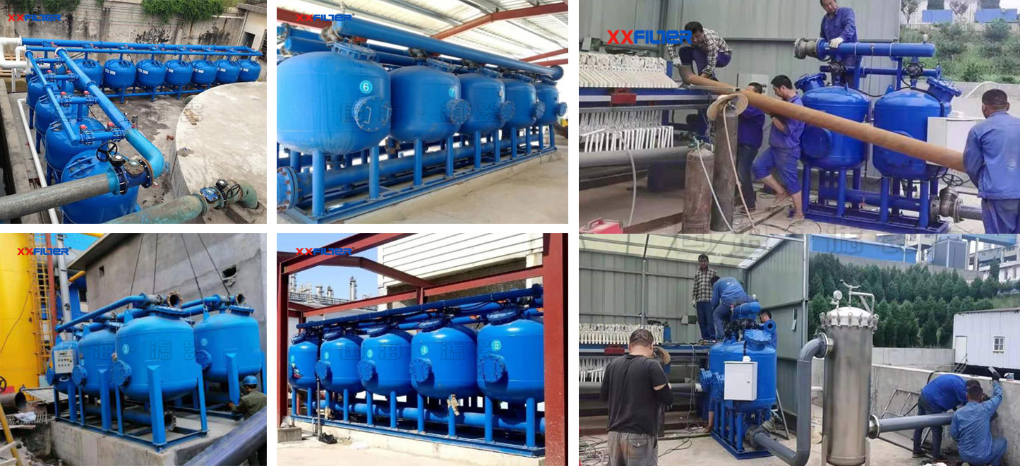3、过滤水量大,过滤效果好,过滤流速快,正常滤速可在40m/h左右,根据水质可达60m/h;过滤器反洗采用产品水,且不必设增压泵和反洗泵;反洗历时2-3min,反洗水量<3m3。过滤精度高,杂质过滤精度可在0.10mm以下,出水浊度可小于0.5NTU。过滤系统由标准单元砂缸组成,过滤流量可从30.6立方米/小时增至2500立方米/小时。